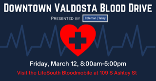 Coleman Talley will be hosting a blood drive in partnership with LifeSouth on Friday, March 12 from 8:00am to 5:00pm. The donation event will take place in the public parking lot adjacent to the firm’s office at 109 South Ashley Street and is open to anyone who would like to participate.